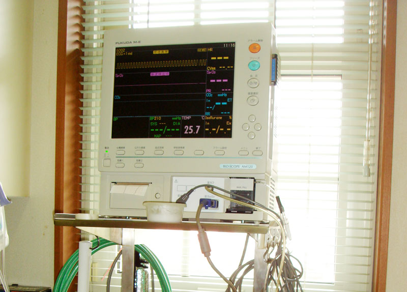 他設備としまして、レントゲン、手術室兼処置室、高圧蒸気滅菌機、ガス滅菌機、輸液ポンプ(自動で点滴の速度や量を管理する)もございます。